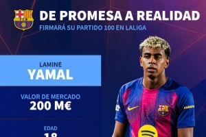 据德国转会市场统计,如果18岁的亚马尔此役出战,他将达成西甲100场比赛里程碑。